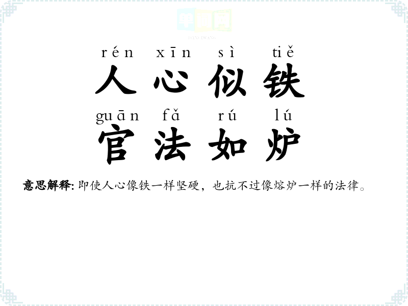 | 人心似铁,官法如炉 | 即使人心像铁一样坚硬,也抗不过像熔炉一样的法律。 |