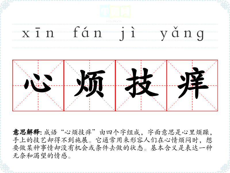 成语“心烦技痒”由四个字组成,字面意思是心里烦躁,手上的技艺却得不到施展。它通常用来形容人们在心情烦闷时,想要做某种事情却没有机会或条件去做的状态。基本含义是表达一种无奈和渴望的情感。