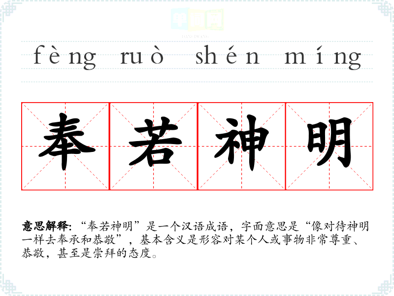 “奉若神明”是一个汉语成语,字面意思是“像对待神明一样去奉承和恭敬”,基本含义是形容对某个人或事物非常尊重、恭敬,甚至是崇拜的态度。