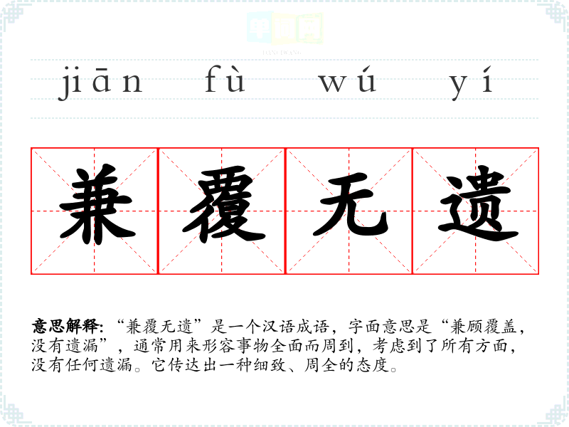 “兼覆无遗”是一个汉语成语,字面意思是“兼顾覆盖,没有遗漏”,通常用来形容事物全面而周到,考虑到了所有方面,没有任何遗漏。它传达出一种细致、周全的态度。