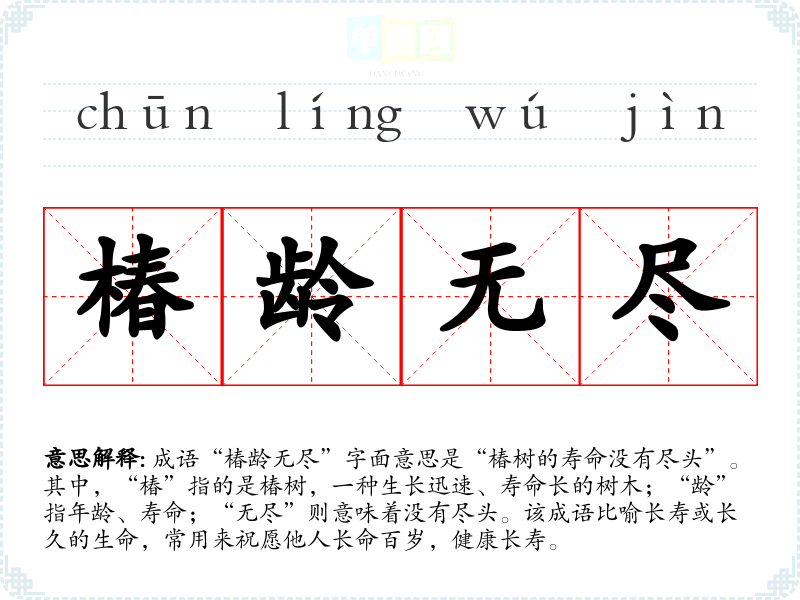 成语“椿龄无尽”字面意思是“椿树的寿命没有尽头”。其中,“椿”指的是椿树,一种生长迅速、寿命长的树木;“龄”指年龄、寿命;“无尽”则意味着没有尽头。该成语比喻长寿或长久的生命,常用来祝愿他人长命百岁,健康长寿。