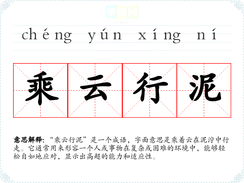 “乘云行泥”是一个成语,字面意思是乘着云在泥泞中行走。它通常用来形容一个人或事物在复杂或困难的环境中,能够轻松自如地应对,显示出高超的能力和适应性。