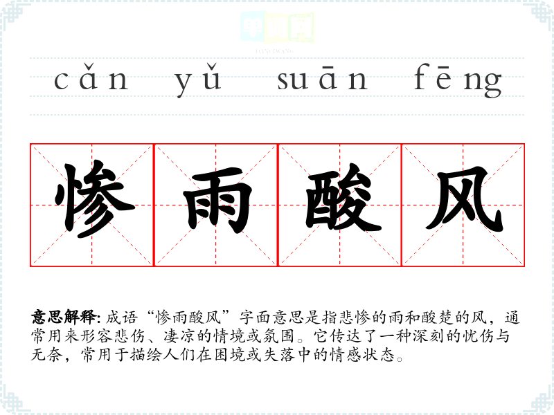 “惨雨酸风”让我联想到那些在逆境中挣扎的人们,以及他们在面对困境时的无奈与悲伤。这个成语有助于我更深刻地理解人类情感的复杂性,也促使我在表达时更加关注细腻的情感变化。