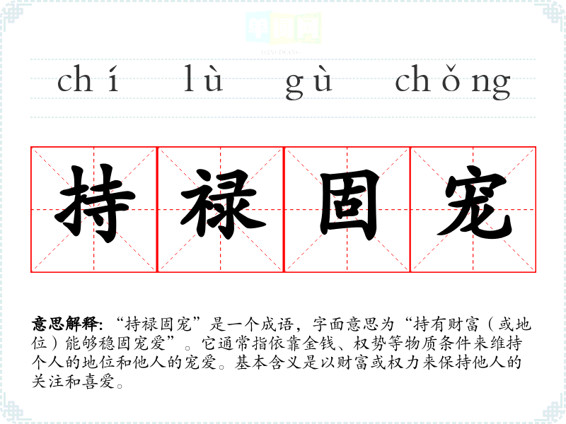 “持禄固宠”是一个成语,字面意思为“持有财富(或地位)能够稳固宠爱”。它通常指依靠金钱、权势等物质条件来维持个人的地位和他人的宠爱。基本含义是以财富或权力来保持他人的关注和喜爱。