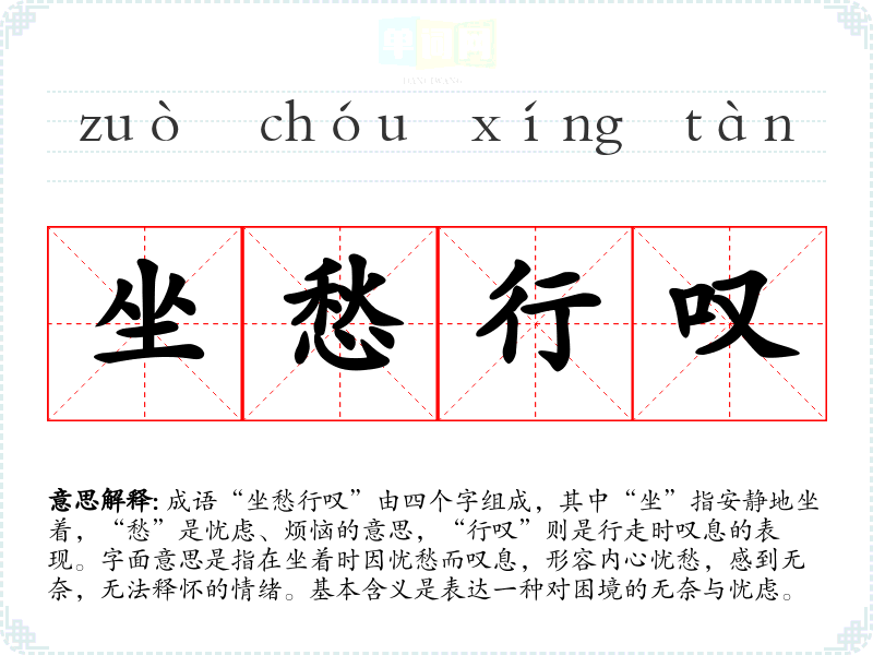 成语“坐愁行叹”由四个字组成,其中“坐”指安静地坐着,“愁”是忧虑、烦恼的意思,“行叹”则是行走时叹息的表现。字面意思是指在坐着时因忧愁而叹息,形容内心忧愁,感到无奈,无法释怀的情绪。基本含义是表达一种对困境的无奈与忧虑。