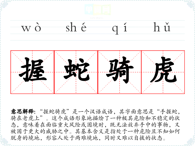 “握蛇骑虎”并没有明确的历史典故或文学出处,但可以追溯到古代**对蛇与虎的象征性解读。蛇通常与阴险、狡诈相关,而虎则象征着力量和威胁。将这两者结合,形成了一种复杂的心理状态,反映了人类在面对危险时的无奈和挣扎。