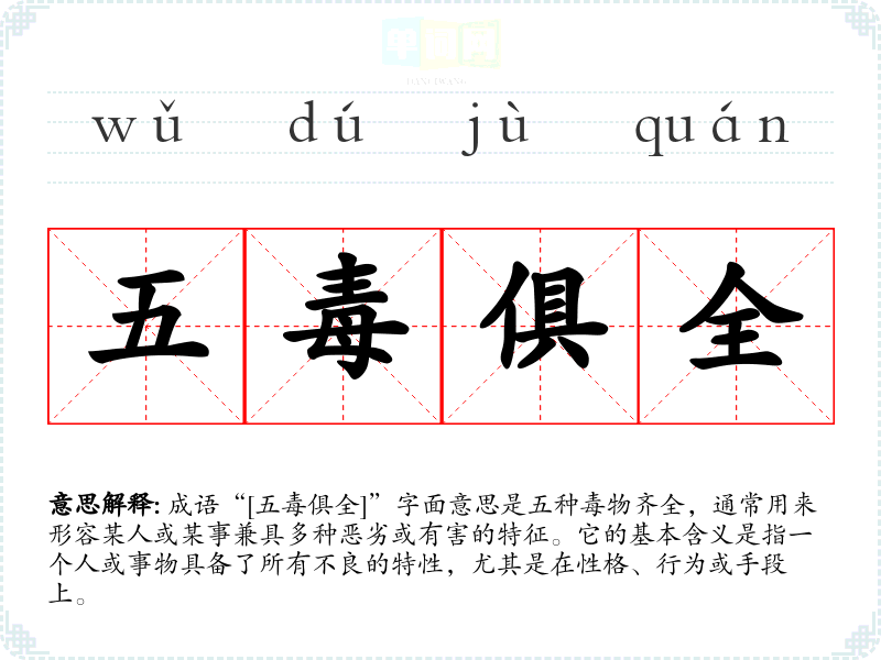 成语“[五毒俱全]”字面意思是五种毒物齐全,通常用来形容某人或某事兼具多种恶劣或有害的特征。它的基本含义是指一个人或事物具备了所有不良的特性,尤其是在性格、行为或手段上。