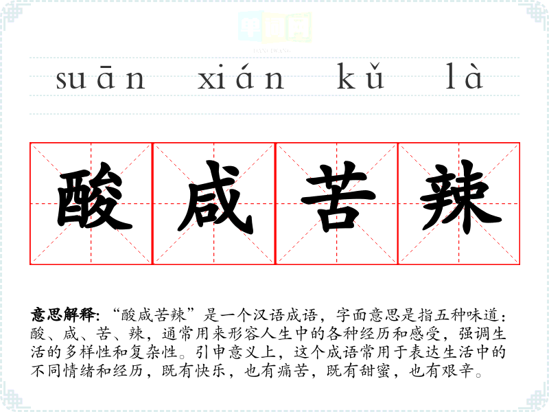 “酸咸苦辣”是一个汉语成语,字面意思是指五种味道:酸、咸、苦、辣,通常用来形容人生中的各种经历和感受,强调生活的多样性和复杂性。引申意义上,这个成语常用于表达生活中的不同情绪和经历,既有快乐,也有痛苦,既有甜蜜,也有艰辛。