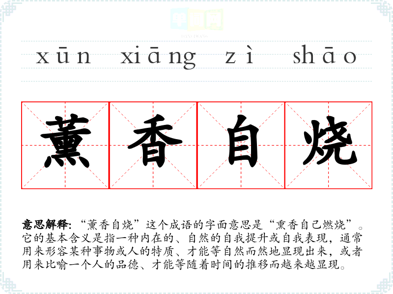 “薰香自烧”这个成语的字面意思是“熏香自己燃烧”。它的基本含义是指一种内在的、自然的自我提升或自我表现,通常用来形容某种事物或人的特质、才能等自然而然地显现出来,或者用来比喻一个人的品德、才能等随着时间的推移而越来越显现。