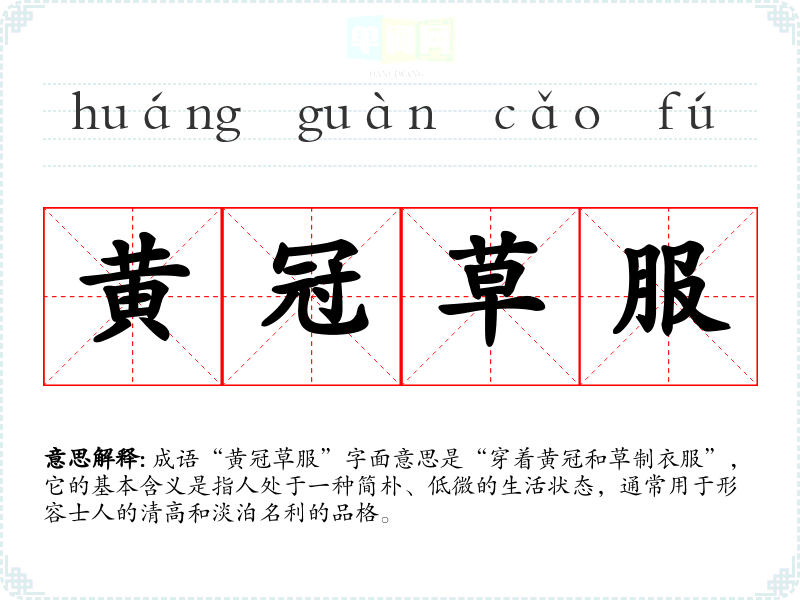 成语“黄冠草服”字面意思是“穿着黄冠和草制衣服”,它的基本含义是指人处于一种简朴、低微的生活状态,通常用于形容士人的清高和淡泊名利的品格。
