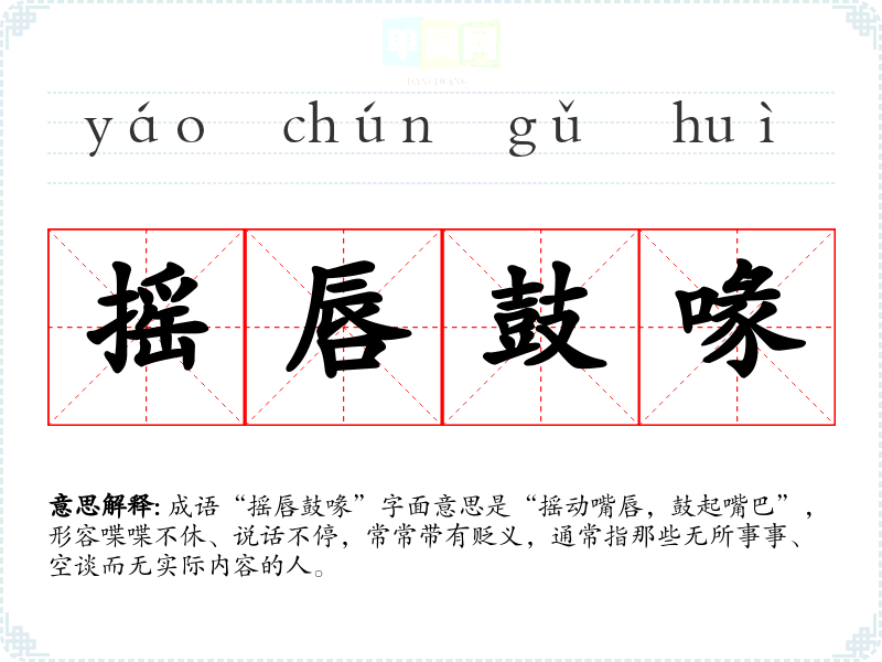 成语“摇唇鼓喙”字面意思是“摇动嘴唇,鼓起嘴巴”,形容喋喋不休、说话不停,常常带有贬义,通常指那些无所事事、空谈而无实际内容的人。