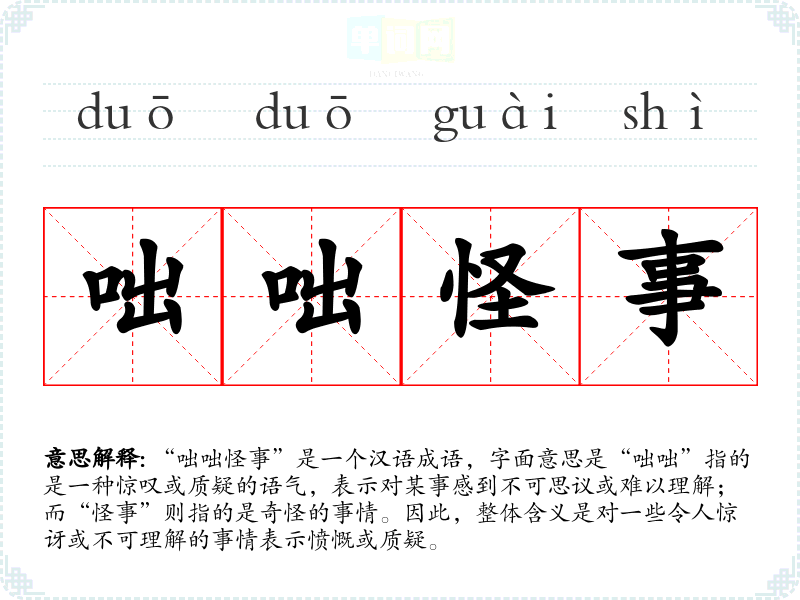 “咄咄怪事”是一个汉语成语,字面意思是“咄咄”指的是一种惊叹或质疑的语气,表示对某事感到不可思议或难以理解;而“怪事”则指的是奇怪的事情。因此,整体含义是对一些令人惊讶或不可理解的事情表示愤慨或质疑。