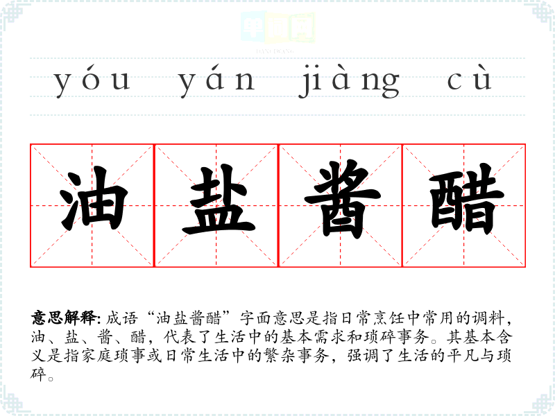 成语“油盐酱醋”字面意思是指日常烹饪中常用的调料,油、盐、酱、醋,代表了生活中的基本需求和琐碎事务。其基本含义是指家庭琐事或日常生活中的繁杂事务,强调了生活的平凡与琐碎。