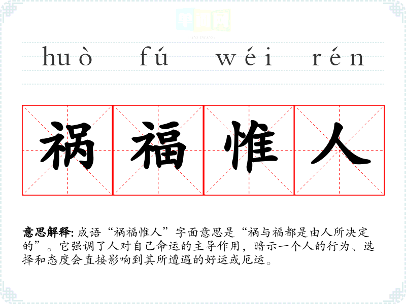 成语“祸福惟人”字面意思是“祸与福都是由人所决定的”。它强调了人对自己命运的主导作用,暗示一个人的行为、选择和态度会直接影响到其所遭遇的好运或厄运。