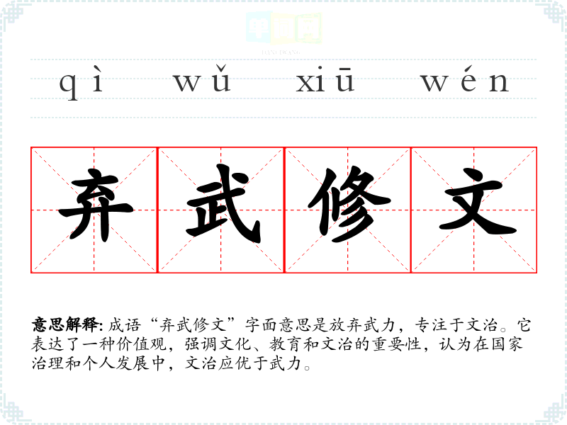 成语“弃武修文”字面意思是放弃武力,专注于文治。它表达了一种价值观,强调文化、教育和文治的重要性,认为在国家治理和个人发展中,文治应优于武力。