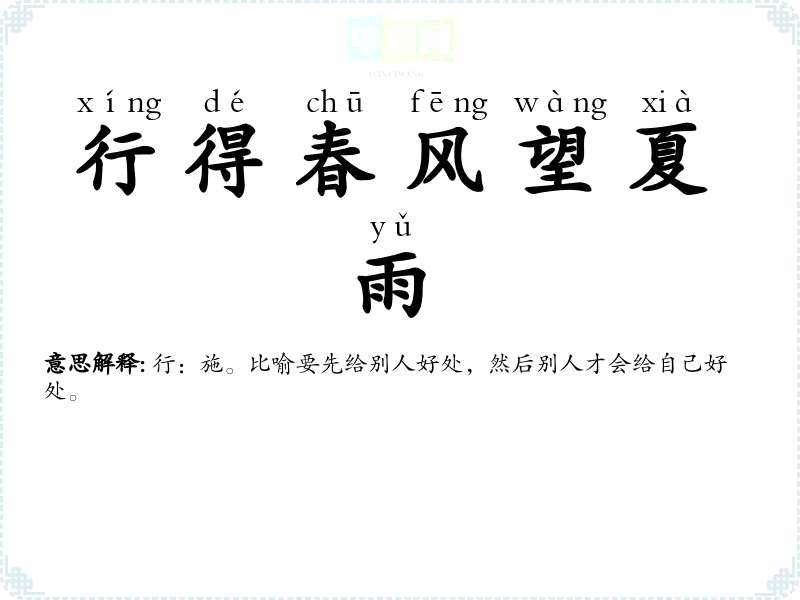 | 一年之计在于春 | 要在一年(或一天)开始时多做并做好工作,为全年(或全天)的工作打好基础。 |
