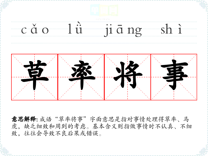 “草率将事”并不是一个广为人知的成语,可能是由“草率”和“将事”两部分构成的表达。可以推测,这个成语的用法反映了对处理事务的态度问题,强调在做事时应当认真对待。