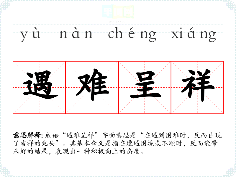 成语“遇难呈祥”字面意思是“在遇到困难时,反而出现了吉祥的兆头”。其基本含义是指在遭遇困境或不顺时,反而能带来好的结果,表现出一种积极向上的态度。