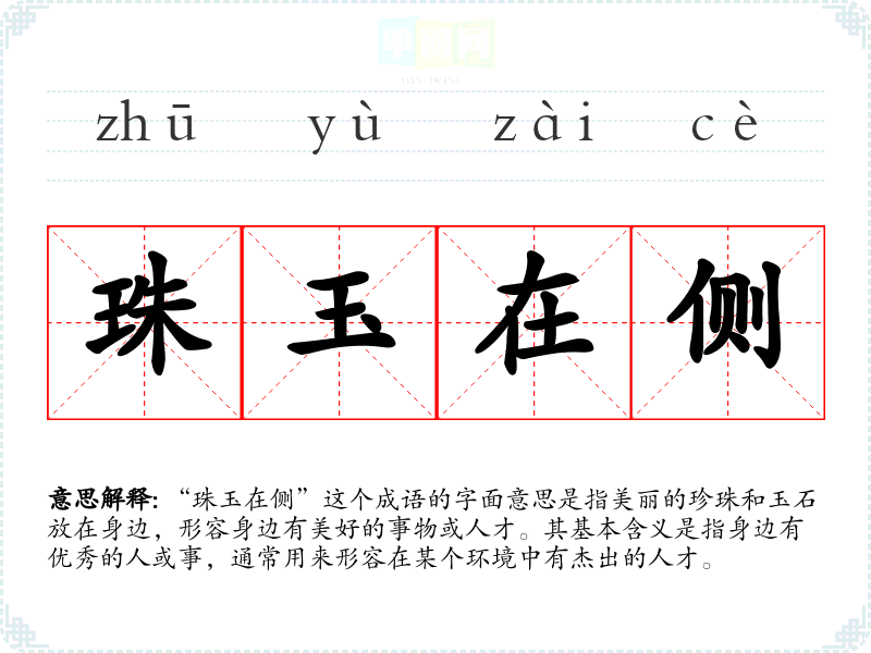 “珠玉在侧”这个成语的字面意思是指美丽的珍珠和玉石放在身边,形容身边有美好的事物或人才。其基本含义是指身边有优秀的人或事,通常用来形容在某个环境中有杰出的人才。