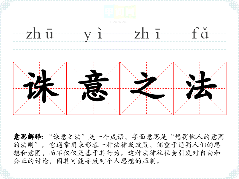“诛意之法”是一个成语,字面意思是“惩罚他人的意图的法则”。它通常用来形容一种法律或政策,侧重于惩罚人们的思想和意图,而不仅仅是基于其行为。这种法律往往会引发对自由和公正的讨论,因其可能导致对个人思想的压制。