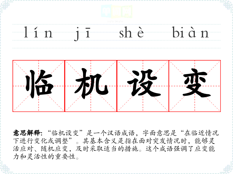 “临机设变”是一个汉语成语,字面意思是“在临近情况下进行变化或调整”。其基本含义是指在面对突发情况时,能够灵活应对、随机应变,及时采取适当的措施。这个成语强调了应变能力和灵活性的重要性。