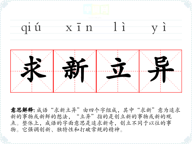 成语“求新立异”由四个字组成,其中“求新”意为追求新的事物或新鲜的想法,“立异”指的是创立新的事物或新的观点。整体上,成语的字面意思是追求新奇,创立不同于以往的事物。它强调创新、独特性和打破常规的精神。
