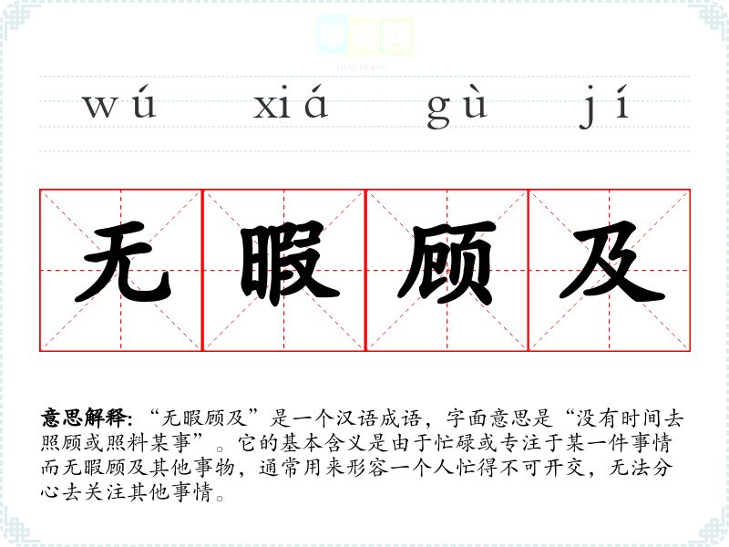 “无暇顾及”是一个汉语成语,字面意思是“没有时间去照顾或照料某事”。它的基本含义是由于忙碌或专注于某一件事情而无暇顾及其他事物,通常用来形容一个人忙得不可开交,无法分心去关注其他事情。