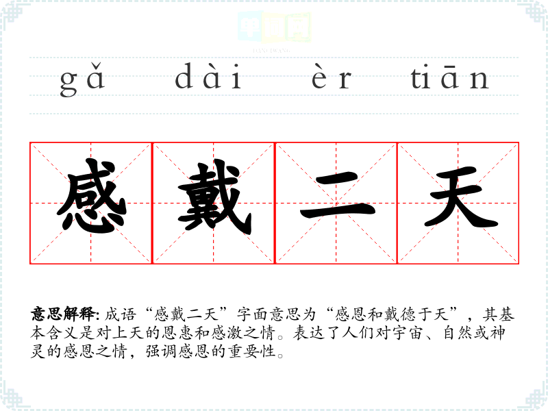 成语“感戴二天”字面意思为“感恩和戴德于天”,其基本含义是对上天的恩惠和感激之情。表达了人们对宇宙、自然或神灵的感恩之情,强调感恩的重要性。