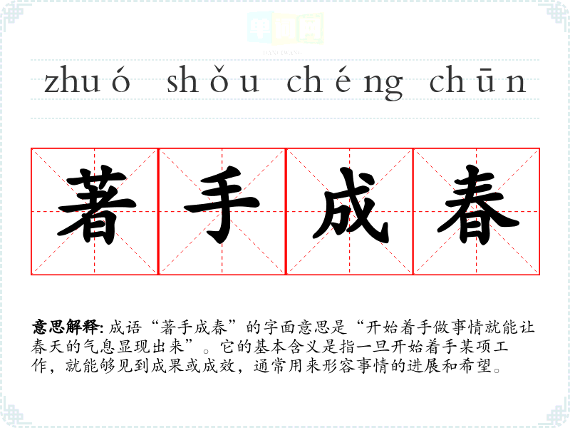 成语“著手成春”的字面意思是“开始着手做事情就能让春天的气息显现出来”。它的基本含义是指一旦开始着手某项工作,就能够见到成果或成效,通常用来形容事情的进展和希望。