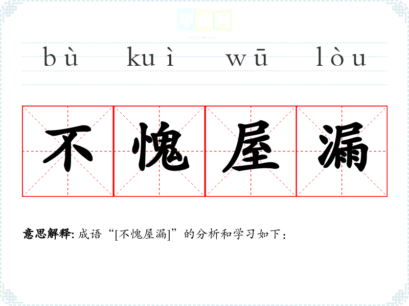 “不愧屋漏”这个成语的字面意思是“不辜负屋漏的情况”,即指对某种情况不感到羞愧。从基本含义来看,这个成语通常用来形容一个人面对自己的缺点、错误或不利的环境时,能够诚实地承认并承担责任。