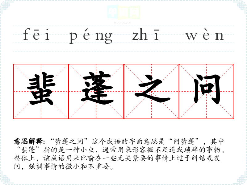 “蜚蓬之问”这个成语的字面意思是“问蜚蓬”,其中“蜚蓬”指的是一种小虫,通常用来形容微不足道或琐碎的事物。整体上,该成语用来比喻在一些无关紧要的事情上过于纠结或发问,强调事情的微小和不重要。