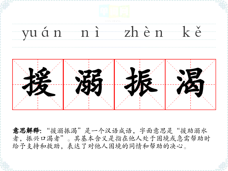“援溺振渴”是一个汉语成语,字面意思是“援助溺水者,振兴口渴者”。其基本含义是指在他人处于困境或急需帮助时给予支持和救助,表达了对他人困境的同情和帮助的决心。