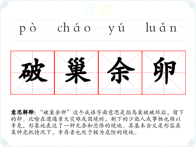 “破巢余卵”这个成语字面意思是指鸟巢被破坏后,留下的卵。比喻在遭遇重大灾难或困境时,剩下的少数人或事物也难以幸免,形象地表达了一种无奈和悲惨的境地。其基本含义是形容在某种危机情况下,幸存者也处于极为危险的境地。
