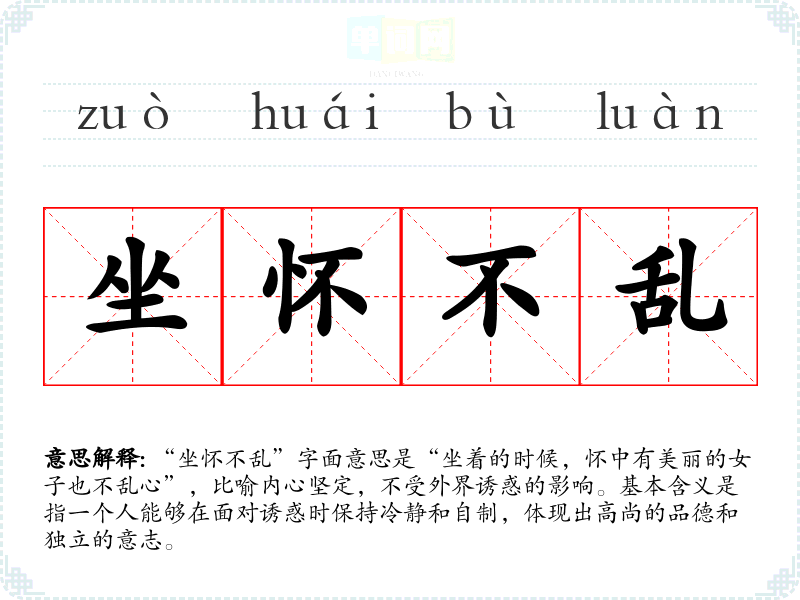 “坐怀不乱”字面意思是“坐着的时候,怀中有美丽的女子也不乱心”,比喻内心坚定,不受外界诱惑的影响。基本含义是指一个人能够在面对诱惑时保持冷静和自制,体现出高尚的品德和独立的意志。