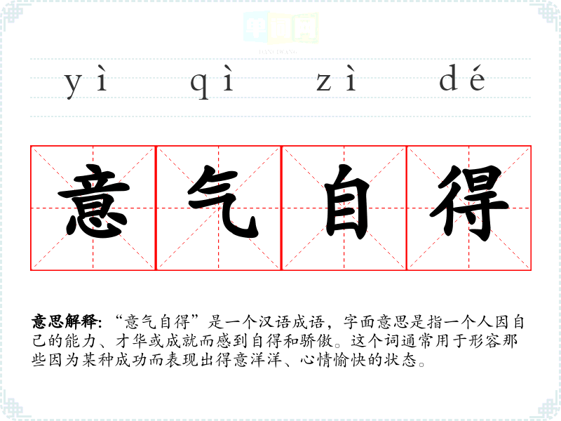 “意气自得”是一个汉语成语,字面意思是指一个人因自己的能力、才华或成就而感到自得和骄傲。这个词通常用于形容那些因为某种成功而表现出得意洋洋、心情愉快的状态。