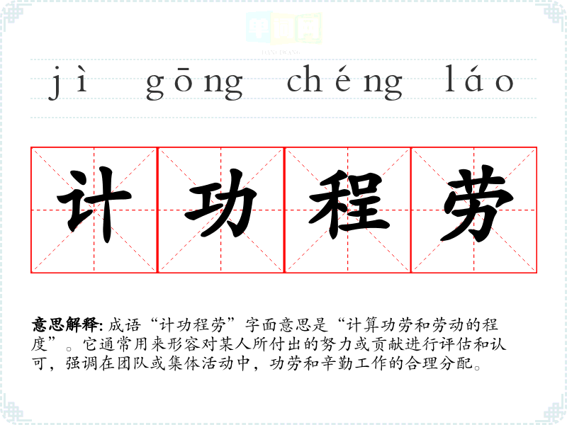 成语“计功程劳”字面意思是“计算功劳和劳动的程度”。它通常用来形容对某人所付出的努力或贡献进行评估和认可,强调在团队或集体活动中,功劳和辛勤工作的合理分配。