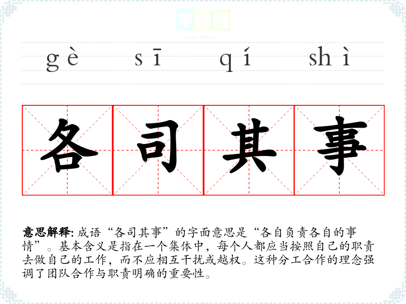 成语“各司其事”的字面意思是“各自负责各自的事情”。基本含义是指在一个集体中,每个人都应当按照自己的职责去做自己的工作,而不应相互干扰或越权。这种分工合作的理念强调了团队合作与职责明确的重要性。