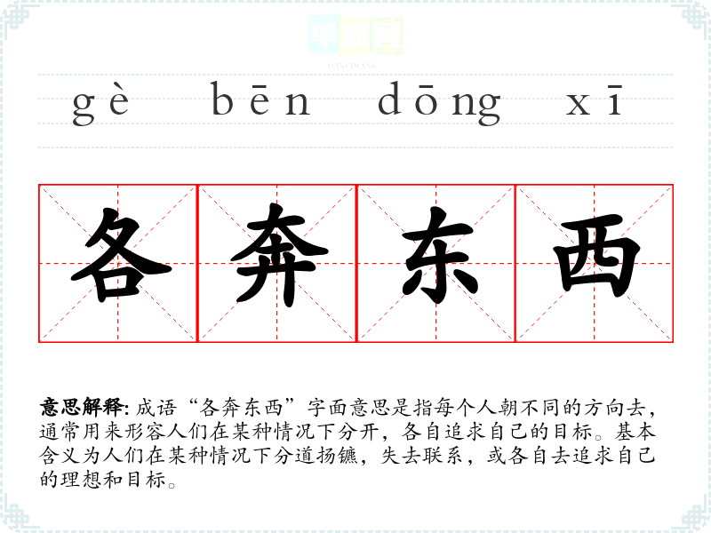 成语“各奔东西”字面意思是指每个人朝不同的方向去,通常用来形容人们在某种情况下分开,各自追求自己的目标。基本含义为人们在某种情况下分道扬镳,失去联系,或各自去追求自己的理想和目标。