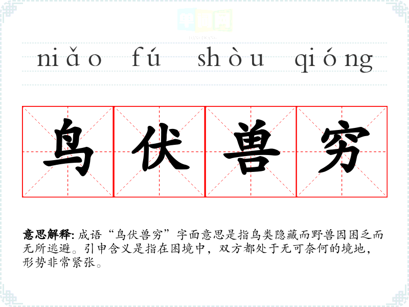 成语“鸟伏兽穷”字面意思是指鸟类隐藏而野兽因困乏而无所逃避。引申含义是指在困境中,双方都处于无可奈何的境地,形势非常紧张。