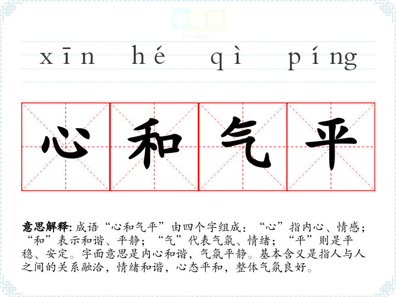 成语“心和气平”由四个字组成:“心”指内心、情感;“和”表示和谐、平静;“气”代表气氛、情绪;“平”则是平稳、安定。字面意思是内心和谐,气氛平静。基本含义是指人与人之间的关系融洽,情绪和谐,心态平和,整体气氛良好。