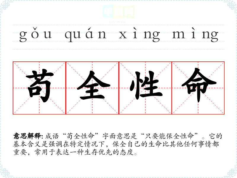 成语“苟全性命”字面意思是“只要能保全性命”。它的基本含义是强调在特定情况下,保全自己的生命比其他任何事情都重要,常用于表达一种生存优先的态度。