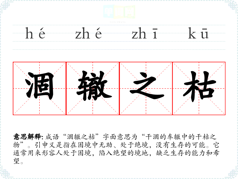 成语“涸辙之枯”字面意思为“干涸的车辙中的干枯之物”。引申义是指在困境中无助、处于绝境,没有生存的可能。它通常用来形容人处于困境,陷入绝望的境地,缺乏生存的能力和希望。