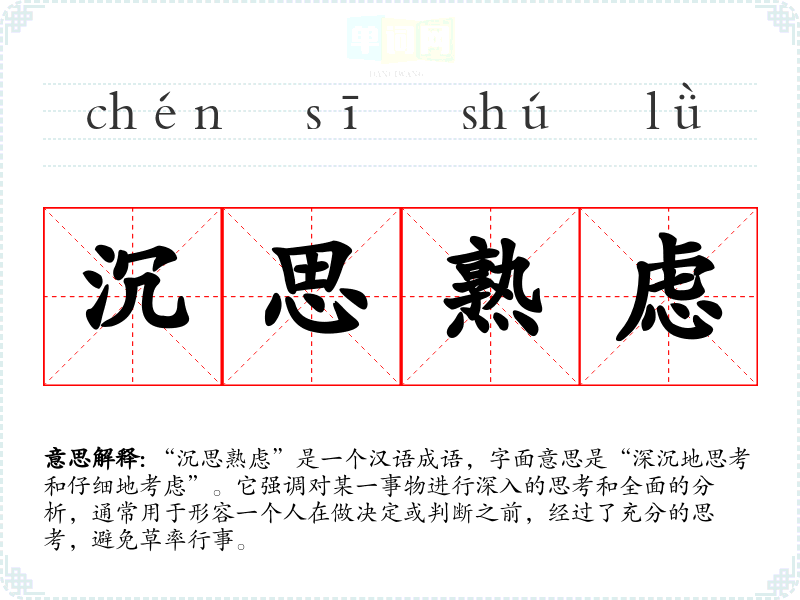 - 深思熟虑:强调深度思考和充分考虑。