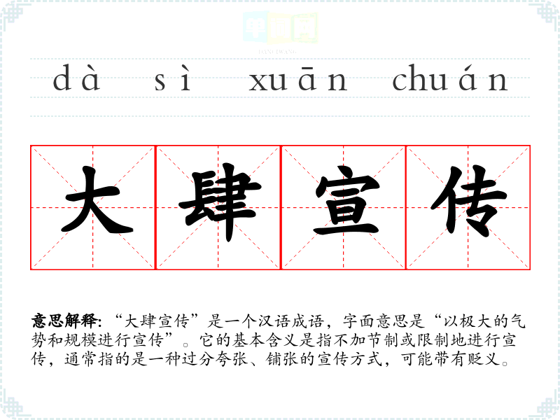 “大肆宣传”是一个汉语成语,字面意思是“以极大的气势和规模进行宣传”。它的基本含义是指不加节制或限制地进行宣传,通常指的是一种过分夸张、铺张的宣传方式,可能带有贬义。