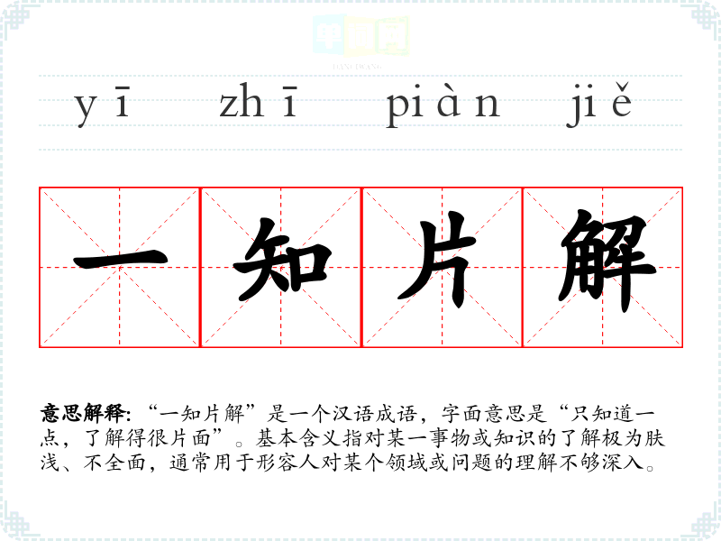 “一知片解”是一个汉语成语,字面意思是“只知道一点,了解得很片面”。基本含义指对某一事物或知识的了解极为肤浅、不全面,通常用于形容人对某个领域或问题的理解不够深入。