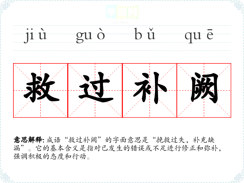 成语“救过补阙”的字面意思是“挽救过失,补充缺漏”。它的基本含义是指对已发生的错误或不足进行修正和弥补,强调积极的态度和行动。