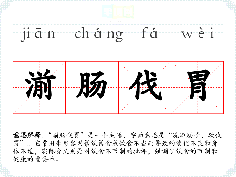 “湔肠伐胃”是一个成语,字面意思是“洗净肠子,砍伐胃”。它常用来形容因暴饮暴食或饮食不当而导致的消化不良和身体不适,实际含义则是对饮食不节制的批评,强调了饮食的节制和健康的重要性。