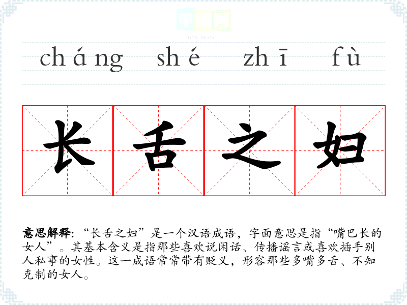 “长舌之妇”是一个汉语成语,字面意思是指“嘴巴长的女人”。其基本含义是指那些喜欢说闲话、传播谣言或喜欢插手别人私事的女性。这一成语常常带有贬义,形容那些多嘴多舌、不知克制的女人。