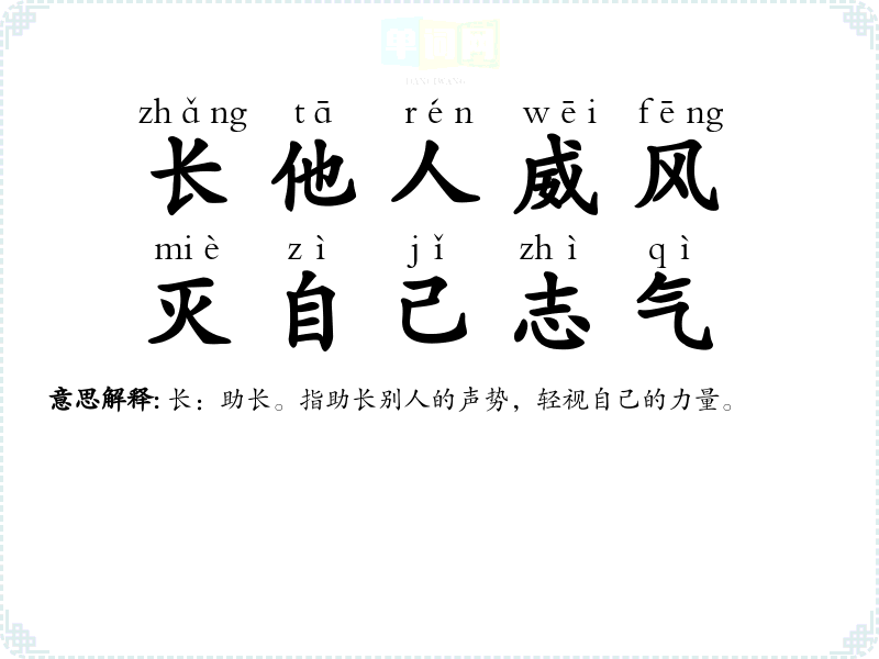 | 长他人锐气,灭自己威风 | 长:助长。指助长别人的声势,轻视自己的力量。 |