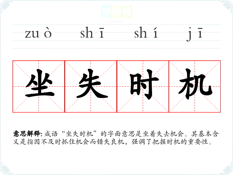 成语“坐失时机”的字面意思是坐着失去机会。其基本含义是指因不及时抓住机会而错失良机,强调了把握时机的重要性。